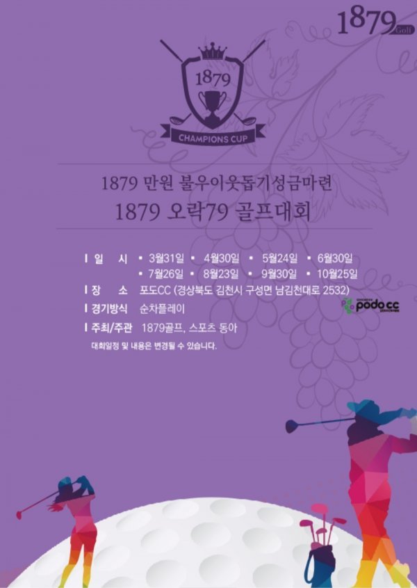 1879만원 불우이웃돕기 성금마련 골프 대회는 포도CC를 비롯해 뉴서울CC, 군산CC, 골프클럽Q(안성), 센추리21CC(원주), 아라미르CC(창원) 등 전국 6개 골프장에서 순차적으로 총 50회 진행되는 아마추어 대회다. 다음 대회는 5일 센추리21CC에서 펼쳐진다. 12월에는 50개 대회의 우승자들이 참가하는 왕중왕전을 통해 2021시즌 챔피언을 가릴 예정이다. 대회 참가 문의 및 신청은 공식홈페이지 1879골프 공식몰에서 할 수 있다. 참가비는 18만7900원(카트비, 캐디피, 식대 별도).