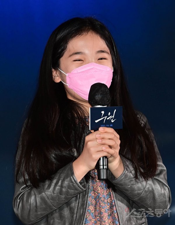 아역배우 장재희가 1일 서울 광진구 롯데시네마 건대입구점에서 열린 영화 ‘구원’ 언론시사회에서 인사말을 하고 있다.