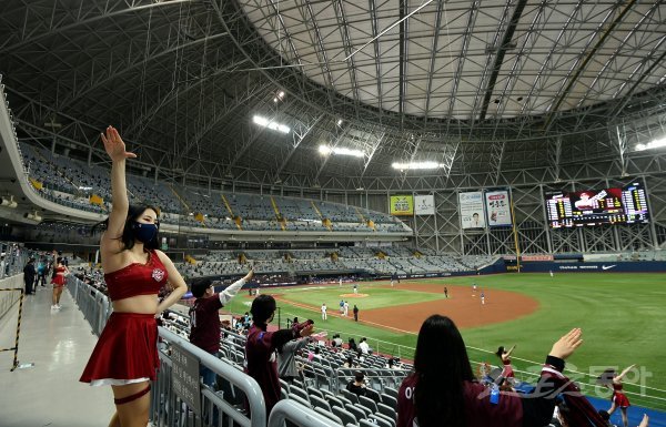 3일 서울 고척스카이돔에서 ‘2021 신한은행 SOL KBO리그’ 키움 히어로즈와 삼성 라이온즈의 개막경기가 열렸다. 전체 관중석의 10% 관중이 입장해 사회적 거리두기를 지키며 응원을 펼치고 있다.