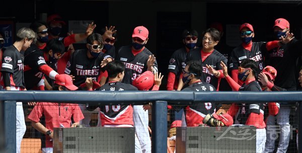 3회초 2사 3루 KIA 적시타 때 득점한 3루주자 최원준이 더그아웃에서 하이파이브 하고 있다.