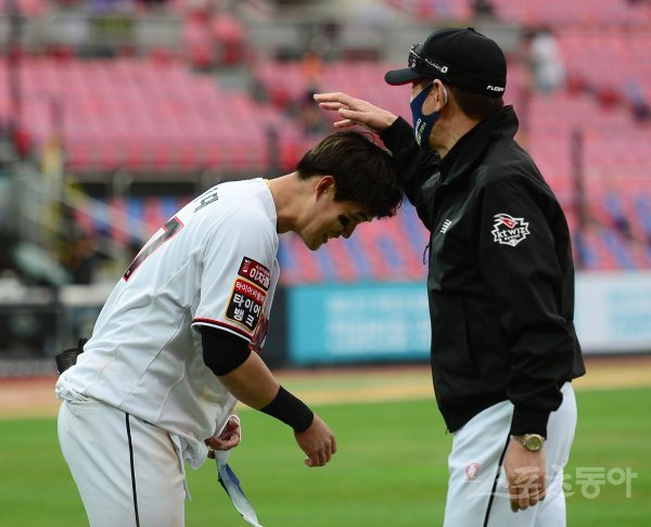 KT가 한화에 3-2로 승리를 거둔 뒤 배정대가 이강철 감독의 축하를 받고 있다.