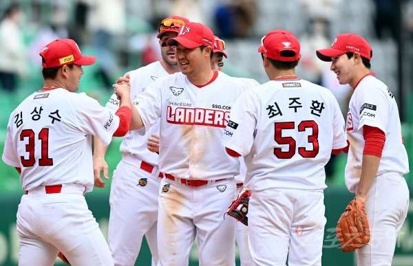 SSG가 롯데에 5-3으로 승리한 뒤 선수들이 그라운에서 기쁨을 나누고 있다.