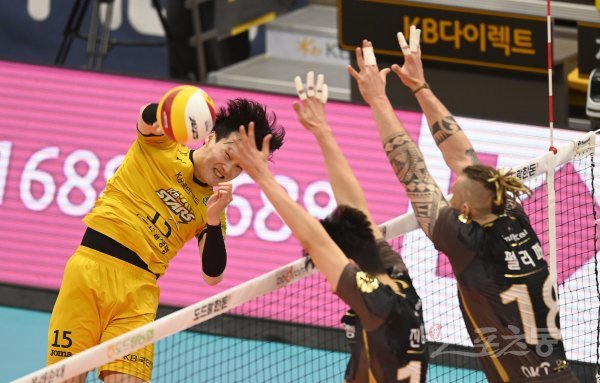 4일 의정부체육관에서 열린 ‘도드람 2020~2021 V-리그’ 남자부 포스트시즌 준플레이오프 KB손해보험과 OK금융그룹 경기에서 OK손해보험 김정호가 OK금융그룹의 블로킹 사이로 스파이크를 날리고 있다.