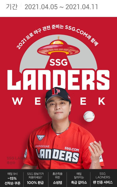 신세계그룹의 통합 온라인쇼핑몰인 SSG닷컴은 5일 “SSG랜더스의 창단을 기념해 오늘부터 11일까지 ‘랜더스 위크’라는 타이틀로 각종 할인행사를 실시한다”며 “광고 모델로 추신수 선수를 선정했다”고 밝혔다. ‘랜더스 위크’ 행사 기간에는 매일 오전 9시부터 SSG페이 결제 시 사용 가능한 15% 할인 쿠폰과 일반결제 12% 할인 쿠폰이 각각 선착순 2만 명에게 제공된다. 또 쓱배송이나 새벽배송을 처음 이용하는 고객 중 선착순 500명에게 3만 원 이상 구매 시 3만 원을 SSG머니로 돌려주며, 야구 관람과 응원을 위한 야구 글러브, 자외선 차단제 등 야구용품도 할인 판매한다.