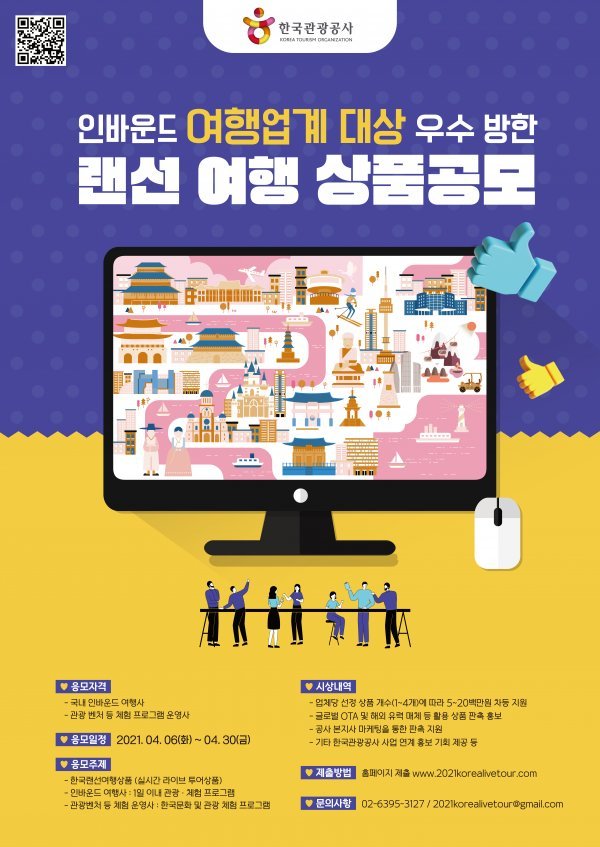 문화체육관광부와 한국관광공사는 코로나 이후 국제 관광시장 선점을 위해 국내 인바운드 여행사와 체험 프로그램 운영사 대상으로 ‘방한 랜선여행 상품’ 공모를 실시한다.라이브투어 방식, 선정시 상품당 500만원 지원
