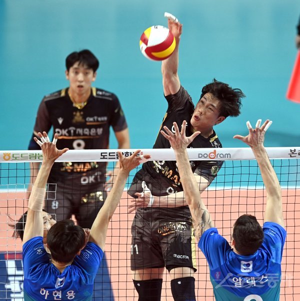 6일 서울 장충체육관에서 열린 ‘도드람 2020~2021 V-리그’ 남자부 플레이오프 1차전 우리카드와 OK금융그룹 경기에서 OK금융그룹 박원빈이 우리카드의 블로킹 사이로 스파이크를 날리고 있다.
