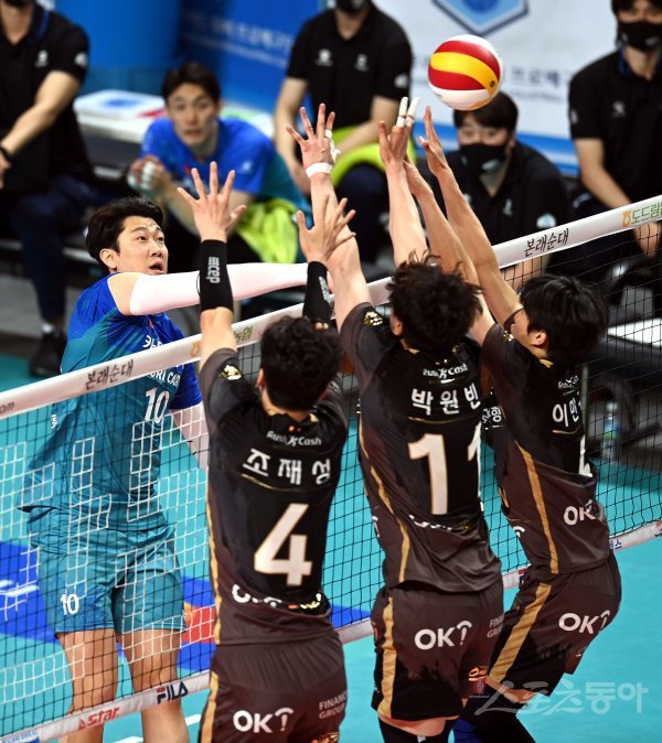 6일 서울 장충체육관에서 열린 ‘도드람 2020~2021 V-리그’ 남자부 플레이오프 1차전 우리카드와 OK금융그룹 경기에서 우리카드 나경복이 OK금융그룹의 블로킹 사이로 밀어넣기 공격을 하고 있다.