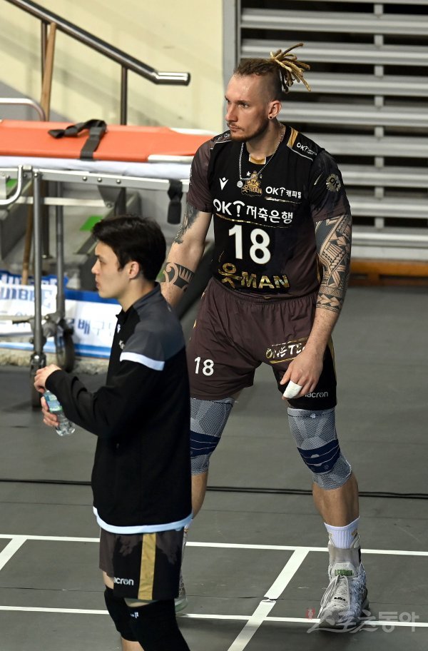 6일 서울 장충체육관에서 열린 ‘도드람 2020~2021 V-리그’ 남자부 플레이오프 1차전 우리카드와 OK금융그룹 경기에서 OK금융그룹 펠리페가 2세트 중 웜업존에서 대기하고 있다.