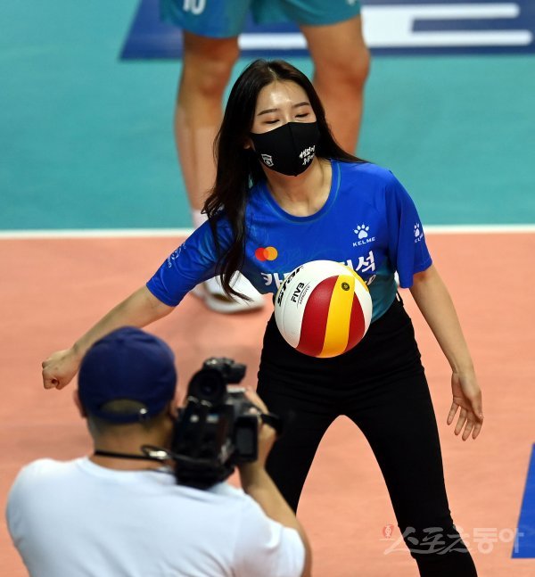 6일 서울 장충체육관에서 열린 ‘도드람 2020~2021 V-리그’ 남자부 플레이오프 1차전 우리카드와 OK금융그룹 경기에서 가수 송하예가 시구를 하고 있다.