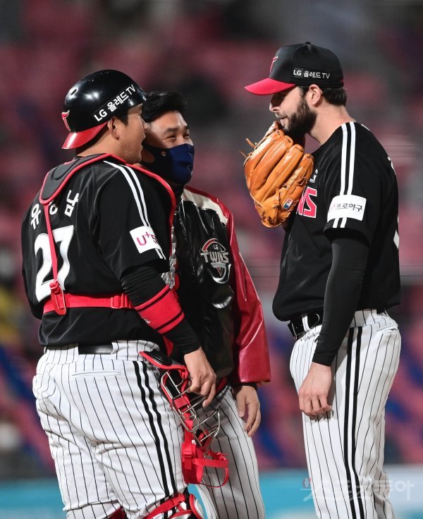 5회말 2사 1, 3루 LG 수아레즈가 마운드에 방문한 유강남과 이야기를 하고 있다.