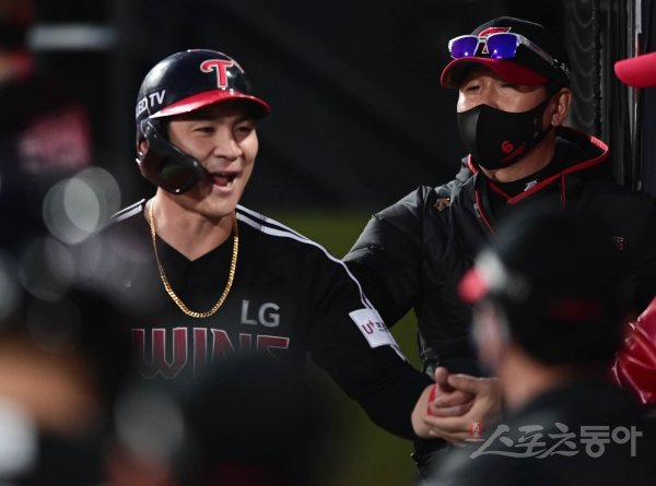 3회말 무사 3루 LG의 희생타 때 류지현 감독이 득점에 성공한 3루주자 오지환을 축하하고 있다.