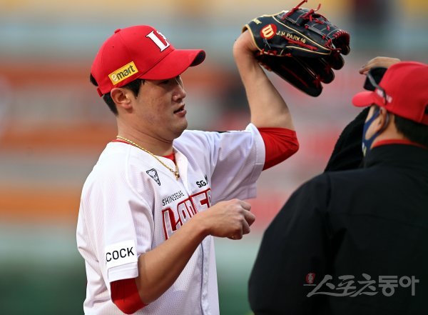 SSG 선발투수 박종훈이 1이닝을 무실점으로 막은 뒤 이닝 종료 후 더그아웃으로 향하며 세리머니를 펼치고 있다.