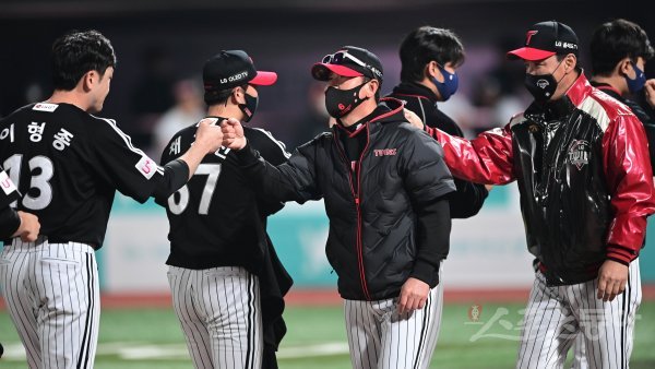 LG가 KT에 3-2로 승리를 거둔 뒤 류지현 감독이 선수들과 기쁨을 나누고 있다.