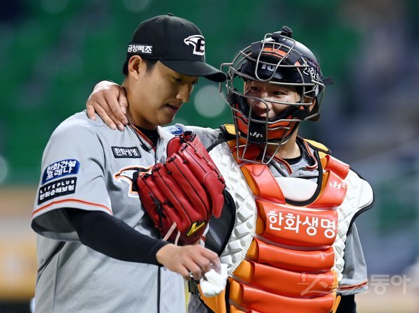 한화 선발투수 김이환이 2회까지 무실점으로 SSG 공격을 막은 뒤 이닝 종료 후 최재훈과 이야기를 나누고 있다.