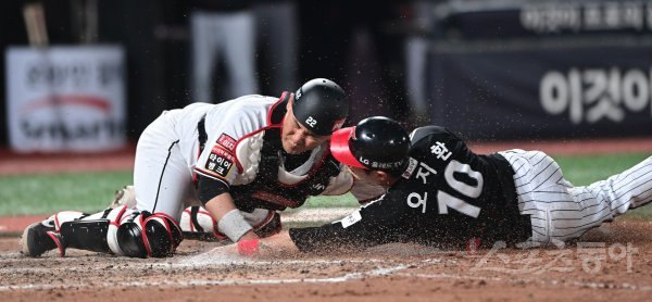 8회초 1사 1, 3루 LG의 우익수 뜬공 때 KT 포수 장성우가 홈으로 파고드는 3루주자 오지환을 태그 아웃시키고 있다.