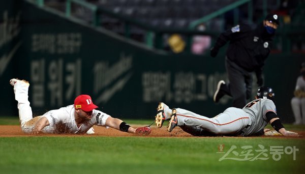 9회초 무사 1루에서 한화 이성열의 1루 라인드라이브 타구를 SSG 로맥이 잡아 1루 주자 하주석에게 태그를 노렸으나 세이프되고 있다.