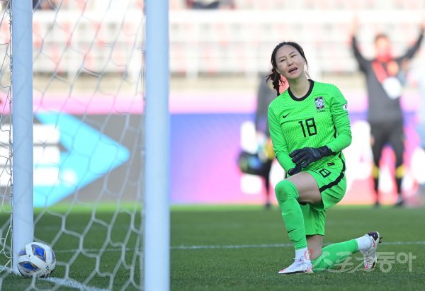 8일 고양종합운동장에서 열린 신세계 이마트 후원 2020 도쿄올림픽 여자축구 아시아 최종 예선 플레이오프 1차전 중국과 경기에서 김정미가 페널티킥으로 실점한 후 아쉬워하고 있다.