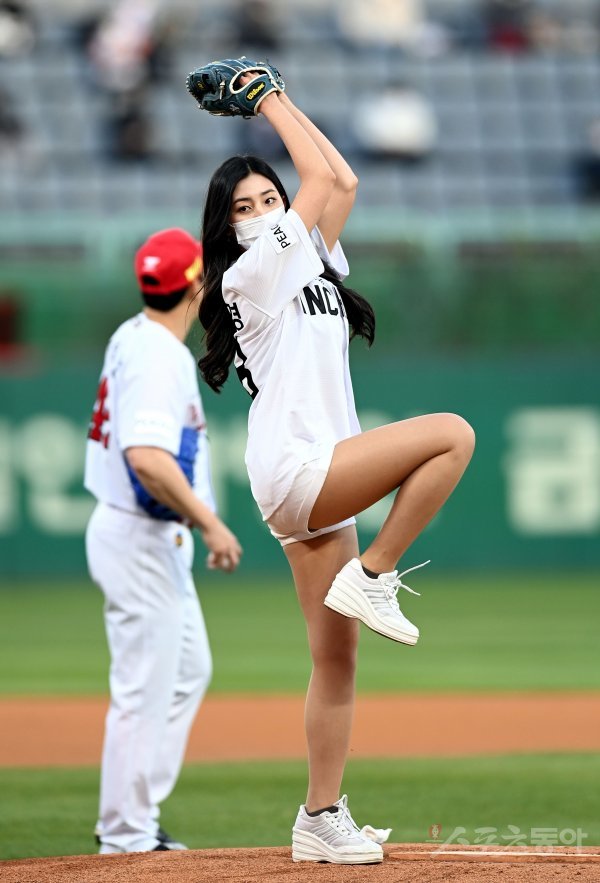 경기에 앞서 SSG 목나경 치어리더가 시구를 던지고 있다.