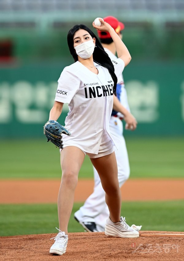 경기에 앞서 SSG 목나경 치어리더가 시구를 던지고 있다.