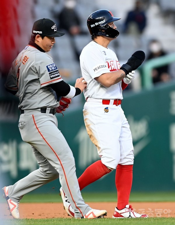 1회말 1사 2, 3루에서 SSG 최정의 1타점 희생플라이 때 3루로 달리던 추신수가 한화 노시환에게 태그 아웃되고 있다.