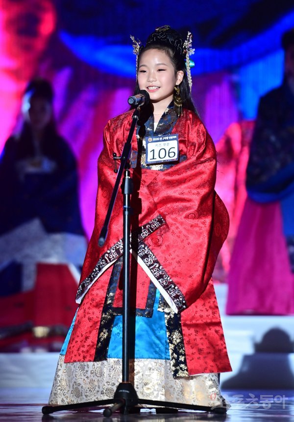 키즈 부문 106번 이하진이 11일 서울 광진구 광장동 그랜드워커힐호텔서울에서 열린 ‘2020 선덕여왕’ 선발대회에서 자기소개를 하고 있다.