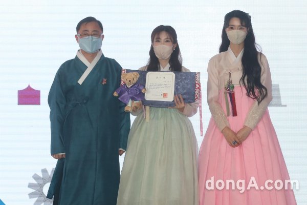 오영우 차관, 전효성, 권나라(왼쪽부터)가 12일 오후 서울 중구 동대문디자인플라자살림터 크레아 오픈라운지에서 열린 \'2021 봄 한복문화주간\' 한복사랑 감사장 수여식에서 수상 후 포즈를 취하고 있다.