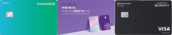 롯데카드가 뱅크샐러드와 손잡고 내놓은 ‘빨대카드’, KB국민카드 ‘커피빈 전용 신용카드’, ‘메리어트 본보이 더 베스트 신한카드’(왼쪽부터). 사진제공|롯데카드·KB국민카드·신한카드