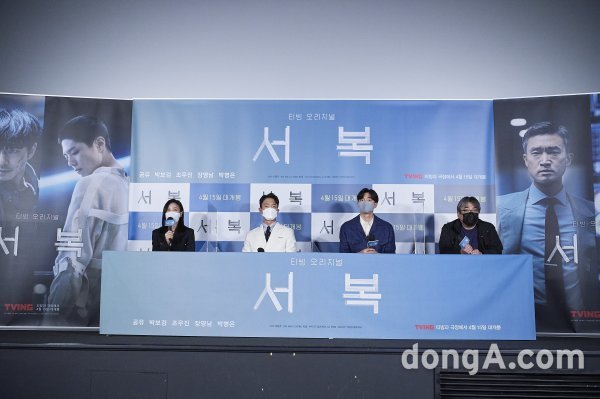 12일 오후 서울 용산구 한 멀티플렉스관에서 진행된 영화 \'서복\' 기자간담회에서 출연진이 참석해 인사말을 하고 있다.