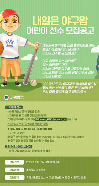 채널A가 올해 여름 방송하는 신규 스포츠예능 프로그램 ‘내일은 야구왕’을 통해 차세대 야구스타를 찾는다. 어린이 야구선수들의 도전과 성장을 담을 ‘내일은 야구왕’ 제작진은 12일부터 30일까지 이메일로 참가 지원을 받는다. 초등학교 4∼6학년까지 누구나 신청할 수 있다. 개별 테스트, 면접 등을 거쳐 최종 멤버를 선발한다. 제작진은 12일 “어린이 야구 발전에 기여하겠다”면서 “안동시와 동아일보가 공동 개최하는 ‘제1회 황금사자기 어린이 야구대회’(가칭)에도 도전할 계획”이라고 밝혔다.