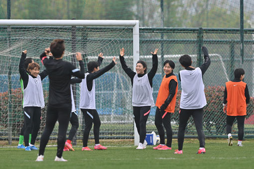 중국과 도쿄올림픽 아시아 최종예선 플레이오프(PO) 2차전 원정경기를 하루 앞둔 12일 여자축구대표선수들이 쑤저우 타이후 축구트레이닝센터에서 밝은 표정으로 훈련을 하고 있다. 사진제공|대한축구협회