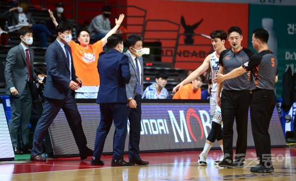 12일 경기도 고양체육관에서 열린 ‘2020-2021 현대모비스 프로농구’ 6강 플레이오프 2차전 고양 오리온과 인천 전자랜드 경기에서 전자랜드 유도훈 감독이 심판 판정에 강하게 항의하고 있다.