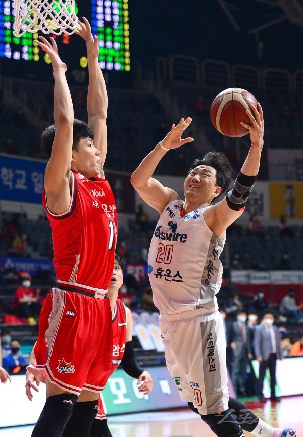 12일 경기도 고양체육관에서 열린 ‘2020-2021 현대모비스 프로농구’ 6강 플레이오프 2차전 고양 오리온과 인천 전자랜드 경기에서 전자랜드 정영삼이 오리온의 수비를 뚫고 골밑을 공격하고 있다.