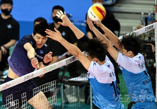 대한항공 정지석이 우리카드 블로커를 피해 스파이크를 날리고 있다.