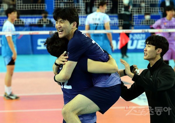대한항공이 우리카드에 세트 스코어 3-2로 승리한 뒤 선수들이 코트에서 기쁨을 나누고 있다.