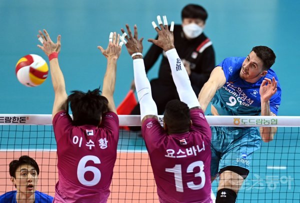 14일 서울 장충체육관에서 열린 ‘도드람 2020~2021 V-리그’ 남자부 챔피언결정전 3차전 우리카드와 대한항공 경기에서 우리카드 알렉스가 대한항공의 블로킹 사이로 스파이크를 날리고 있다.