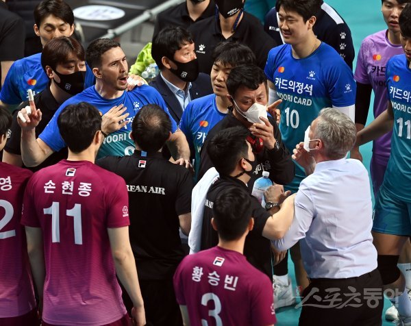 14일 서울 장충체육관에서 열린 ‘도드람 2020~2021 V-리그’ 남자부 챔피언결정전 3차전 우리카드와 대한항공 경기에서 우리카드 알렉스가 서브 득점으로 1세트 승리를 확정지으며 한 세리머니로 대한항공 산틸리 감독과 신경전을 벌이고 있다.
