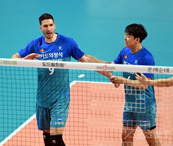 14일 서울 장충체육관에서 열린 ‘도드람 2020~2021 V-리그’ 남자부 챔피언결정전 3차전 우리카드와 대한항공 경기에서 우리카드 알렉스가 서브 득점으로 1세트 승리를 확정지은 후 기뻐하고 있다.
