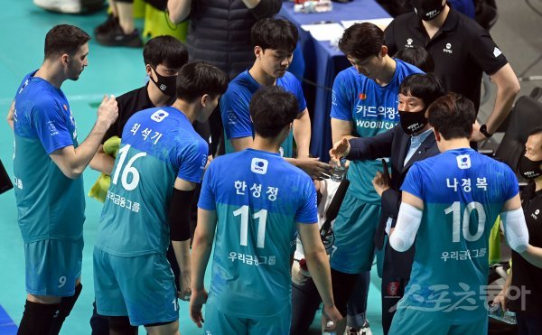 14일 서울 장충체육관에서 열린 ‘도드람 2020~2021 V-리그’ 남자부 챔피언결정전 3차전 우리카드와 대한항공 경기에서 우리카드 신영철 감독이 작전 지시를 하고 있다.