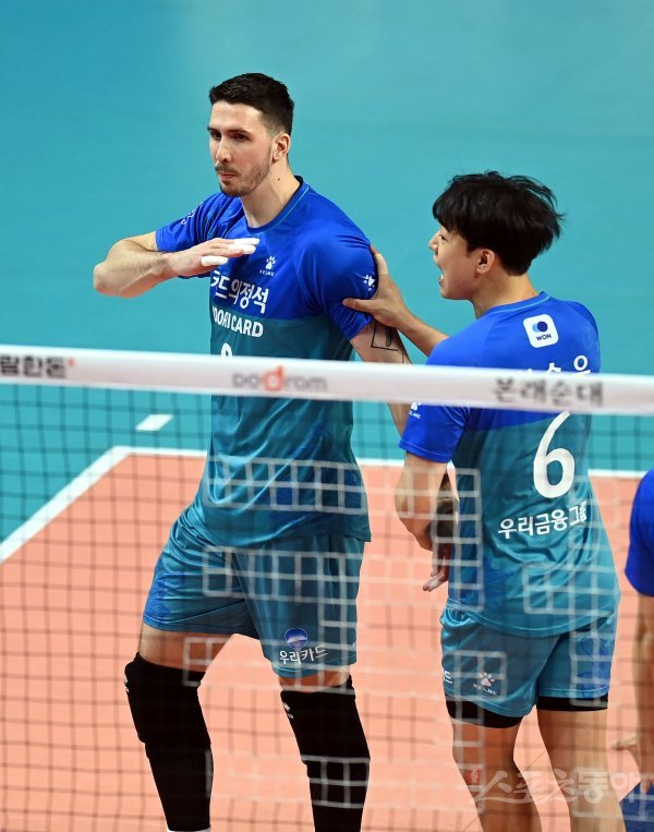 14일 서울 장충체육관에서 열린 ‘도드람 2020~2021 V-리그’ 남자부 챔피언결정전 3차전 우리카드와 대한항공 경기에서 우리카드 알렉스가 서브 득점으로 1세트 승리를 확정지은 후 기뻐하고 있다.
