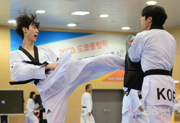 14일 충북 진천국가대표선수촌에서 ‘2020 도쿄하계올림픽대회 G-100 미디어데이’가 열렸다. 태권도 선수 장준이 훈련을 하고 있다.