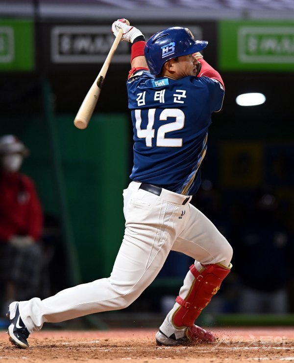 5회초 1사 2, 3루에서 NC 김태군이 2타점 2루타를 날리고 있다.