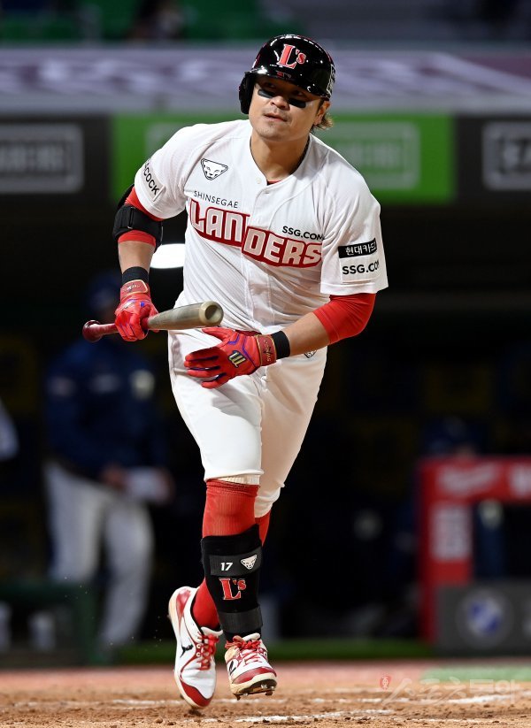 5회말 2사 1루에서 SSG 추신수가 좌익수 뜬공을 날리고 있다.