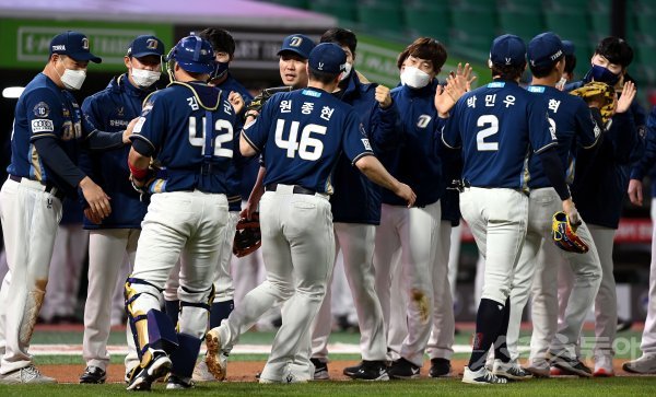NC가 SSG에 3-0으로 승리하며 5연승을 기록한 뒤 선수들이 그라운드에서 기쁨을 나누고 있다.