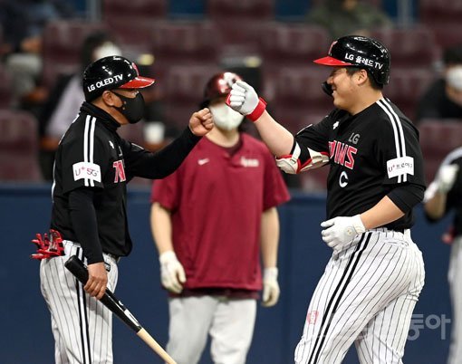 14일 서울 고척스카이돔에서 ‘2021 신한은행 SOL KBO리그‘ LG 트윈스와 키움 히어로즈 경기가 열렸다. 5회초 무사 LG 김현수가 중월 솔로 홈런을 날리고 그라운드를 돌아 홈인해 하이파이브 하고 있다. 고척|김종원 기자 won@donga.com