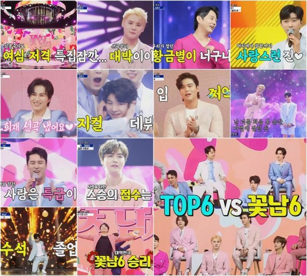 그런가 하면 TOP6는 중간 이벤트로 흥이 넘쳐 오르는 ‘꽃망울’, ‘꽃바람 여인’, ‘99.9’, ‘밀어 밀어’ 등의 트로트 메들리를 화끈하게 선보이며 분위기를 후끈 달아오르게 만들었다. 꽃남6 역시 ‘담배가게 아가씨’, ‘텔미’, ‘엄지척’ 등의 댄스 메들리를 펼치며 몸치 댄스 등의 반전 매력을 드러내 큰 웃음을 자아냈다. 특별히 이날 방송에서는 김희재가 임영웅, 영탁에 이어 세 번째로 발표한 신곡 ‘따라따라와’로 화려한 신곡 무대를 공개했다. ‘따라따라와’는 영탁이 작곡하고 김희재가 작사에 참여한, 새로운 장르의 ‘트렌디 트롯곡’. 심지어 무대 도중 김희재의 바지가 터지는 해프닝이 발생, 신곡 대박을 예감케 했다.