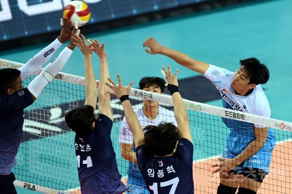 17일 인천 계양체육관에서 ‘2020-2021 도드람 V리그’ 인천 대한항공과 서울 우리카드의 남자부 챔피언결정전 5차전 경기가 열렸다. 우리카드 한성정이 대한항공 블로커를 피해 스파이크를 날리고 있다.