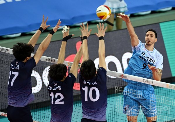 17일 인천 계양체육관에서 ‘2020-2021 도드람 V리그’ 인천 대한항공과 서울 우리카드의 남자부 챔피언결정전 5차전 경기가 열렸다. 우리카드 알렉스가 대한항공 블로커를 피해 스파이크를 날리고 있다.