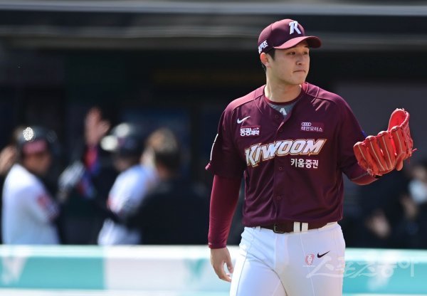 18일 수원KT위즈파크에서 ‘2021 신한은행 SOL KBO리그’ KT 위즈와 키움 히어로즈의 경기가 열렸다. 1회말 2사 1, 2루 KT의 적시타 때 키움 최원태가 실점 후 아쉬워하고 있다.