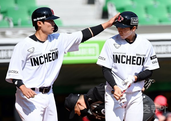 18일 인천 SSG 랜더스필드에서 ‘2021 신한은행 SOL KBO리그’ SSG 랜더스와 KIA 타이거즈의 경기가 열렸다. 4회말 2사 만루에서 밀어내기 볼넷을 얻은 SSG 박성한이 득점에 성공한 이흥련의 축하를 받고 있다.
