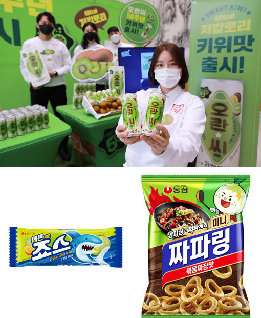 동아오츠카 ‘오란씨 키위’, 농심 ‘짜파링’, 롯데제과 ‘메론먹은 죠스바’(위부터 시계방향). 사진제공 l 동아오츠카·농심·롯데제과
